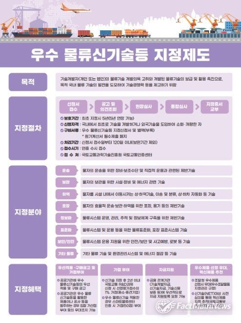 물류신기술 제도는 국내 최초로 개발되거나 외국에서 도입하여 개량한 물류기술을 평가해 △신규성 △진보성 △경제성 △현장적용성 △보급‧활용성이 우수한 기술을 국토교통부 장관이 지정하는 제도다. 물류기술의 보급 및 활용 촉진을 위해 2020년부터 시행됐으며 지금까지 총 9건이 지정됐다.
