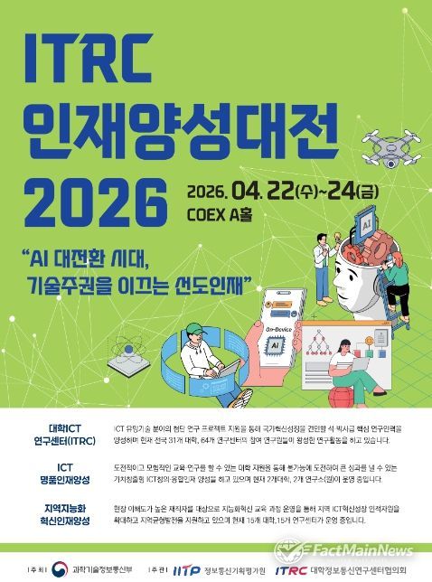 팩트메인뉴스 이훈 기자 | 과학기술정보통신부는 4월 22일부터 4월 24일까지 3일간 국가 AI·ICT R&D 우수성과물 홍보 및사업화 기회를 제공하기 위한 '2026 정보통신(‘ICT’) 기술사업화 페스티벌'과 대학의 석박사급 인재양성 연구·교육 성과 교류·확산을 위한 '2026 ITRC 인재양성대전'을 서울 삼성동 코엑스에서 개최한다.