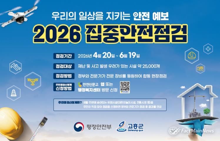 팩트메인뉴스 이훈 기자 | 고흥군은 재난과 안전사고 예방을 위해 4월 20일부터 6월 19일까지 2개월간 ‘2026년 집중안전점검’을 실시한다고 밝혔다.