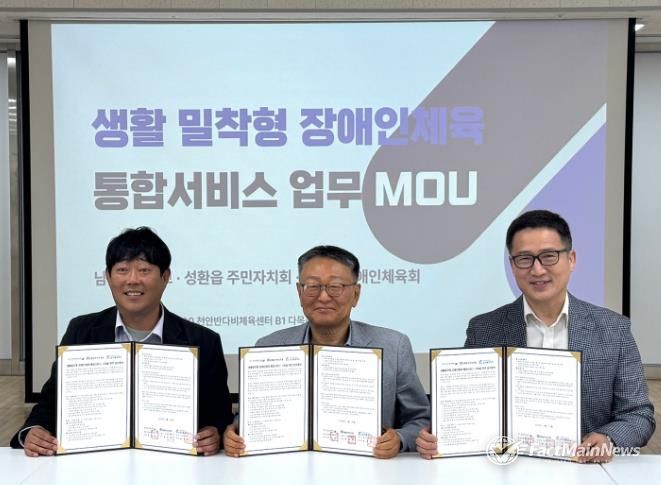 팩트메인뉴스 이훈 기자 | 천안시장애인체육회는 22일 천안반다비체육센터에서 성환읍 주민자치회, 남서울대학교와 ‘생활밀착형 장애인체육 통합서비스 구축을 위한 업무협약’을 체결했다.