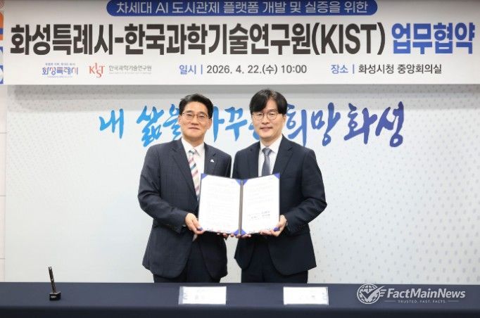 팩트메인뉴스 이훈 기자 | 화성특례시는 도시상태정의 기반의 AI 도시관제 체계로의 전환에 본격 착수했다. 시는 22일 한국과학기술연구원(KIST)과 ‘차세대 AI 도시관제 플랫폼 개발 및 실증’을 위한 업무협약(MOU)을 체결했다.