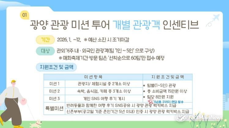 팩트메인뉴스 이훈 기자 | 광양시는 5월 가정의 달과 황금연휴를 앞두고 ‘광양관광 인센티브’와 ‘남도 숙박할인 BIG 이벤트’를 연계한 ‘슬기로운 광양여행’을 제안하며 체류형 관광객 유치에 나섰다.