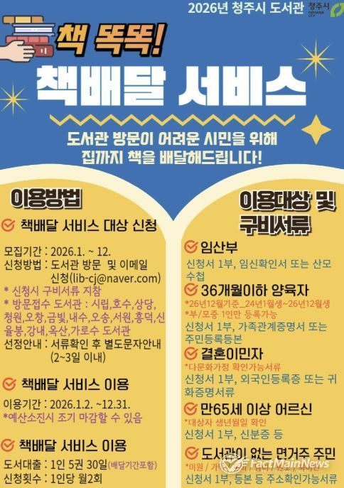 팩트메인뉴스 이훈 기자 | 청주시는 도서관 방문이 어려운 독서 취약계층을 위해 운영 중인 ‘책 똑똑! 책배달 서비스’ 신청자가 600명을 돌파했다고 23일 밝혔다.