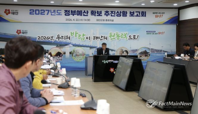 팩트메인뉴스 이훈 기자 | 태안군이 22일 군청 중회의실에서 이주영 부군수와 각 부서장 등 30여 명이 참석한 가운데 ‘2027년도 정부예산 확보 추진 상황 보고회’를 열고 부처 예산안 반영 현황을 점검하며 세부 대응 전략 논의에 나섰다.
