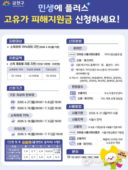 팩트메인뉴스 이훈 기자 | 금천구는 중동 정세 불안 등으로 촉발된 고유가·고환율·고물가 상황에서 구민의 생활 부담을 완화하고 지역경제를 활성화하기 위해 오는 27일부터 ‘1차 고유가 피해지원금’ 신청 접수 및 지급을 시작한다고 밝혔다.
