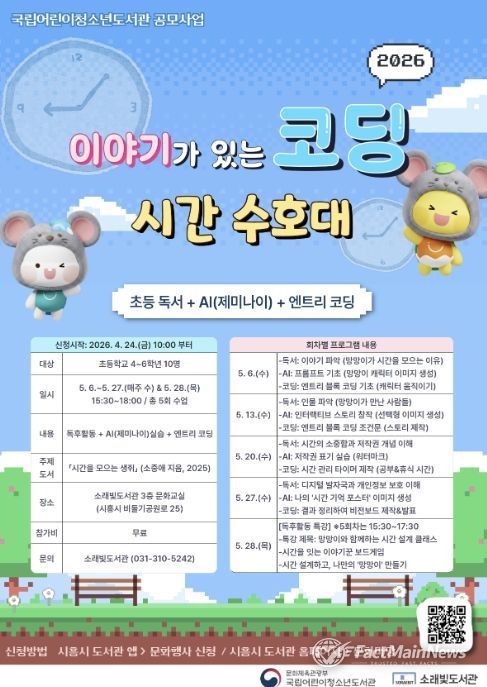 팩트메인뉴스 이훈 기자 | 시흥시 소래빛도서관은 국립어린이청소년도서관이 주최하는 ‘2026년 이야기가 있는 코딩’ 공모사업 운영기관으로 선정돼 오는 5월 6일부터 어린이 대상 독서·디지털 융합 프로그램을 운영한다.