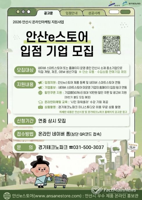 팩트메인뉴스 이훈 기자 | 안산시는 관내 중소기업의 판로 확대와 홍보 강화를 위해 안산시 우수 제품 온라인 홍보관 ‘안산e스토어’에 신규 입점할 기업을 모집한다고 23일 밝혔다.