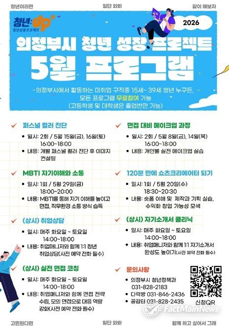 팩트메인뉴스 이훈 기자 | 의정부시는 미취업 청년의 취업 준비 역량 강화를 위해 ‘청년성장프로젝트’ 5월 프로그램을 운영한다.