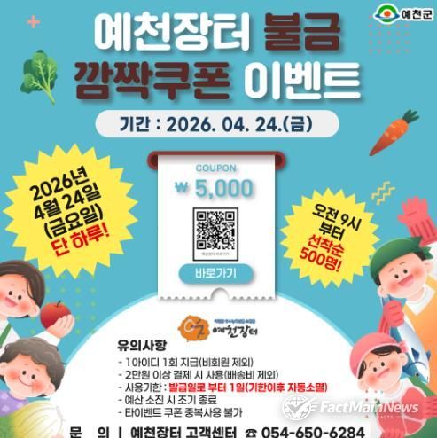 이벤트는 24일 오전 9시부터 예천장터 회원을 대상으로 선착순 500명에게 5,000원 할인쿠폰이 지급되며, 해당 쿠폰은 배송비를 제외한 결제 금액이 2만 원 이상일 경우 즉시 사용할 수 있다.