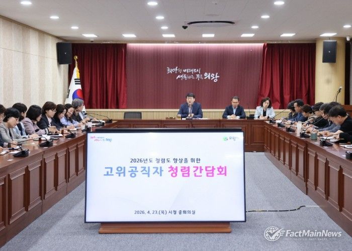 팩트메인뉴스 이훈 기자 | 의왕시가 4월 23일 시청 중회의실에서 고위공직자를 대상으로 청렴간담회를 개최하고, 청렴도 향상을 위한 정책 추진 기반 마련에 나섰다.