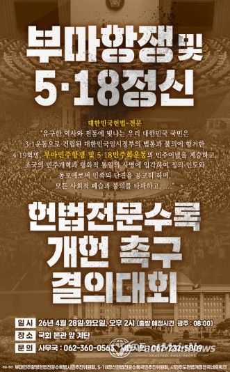 이날 국민결의대회는 5·18정신헌법전문수록국민추진위원회, 부마민주항쟁헌법전문수록범시민추진위원회, 시민주도헌법개정전국네트워크 등 3개 단체가 공동 주최·주관한다.