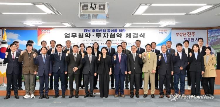 팩트메인뉴스 이훈 기자 | 경상남도와 진주시는 23일 진주시청 문화강좌실에서 경상국립대학교, 한국산업기술시험원(KTL), 우주 분야 기업 4개 사와 함께 경남 우주산업 육성을 위한 업무협약 및 투자협약을 체결했다.