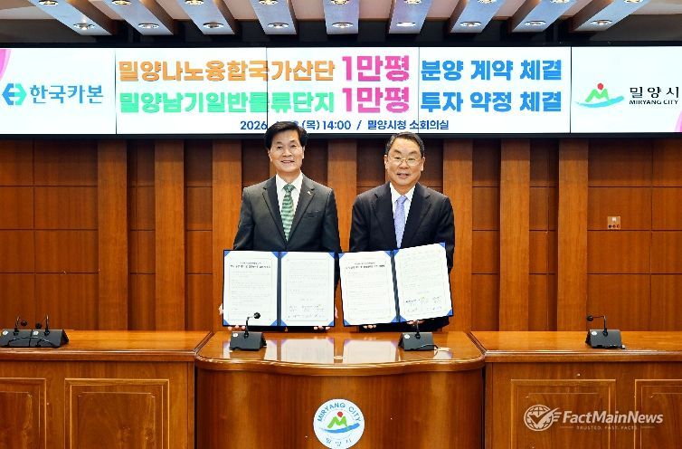 팩트메인뉴스 이훈 기자 | 경남 밀양시는 23일 시청 소회의실에서 ㈜한국카본, 한국토지주택공사 경남지역본부와 함께 ‘밀양나노융합국가산업단지 부지분양 계약 및 밀양남기일반물류단지 투자약정’을 체결했다.