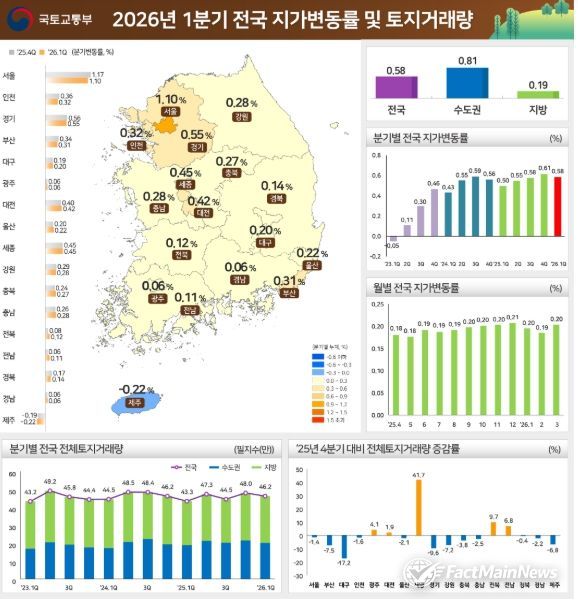 팩트메인뉴스 이훈 기자 | 국토교통부와 한국부동산원(원장 이헌욱)은 '26년 1분기 지가변동률 및 토지거래량을 발표했다.