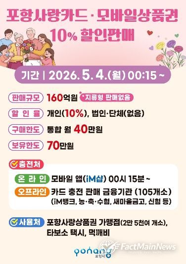 시는 올해 들어 이달까지 총 1,230억 원 규모의 포항사랑상품권을 발행한 데 이어, 이번 할인 판매분 160억 원을 유통해 지역 상권 내 소비를 촉진하고 경기 회복 흐름을 이어간다는 방침이다.