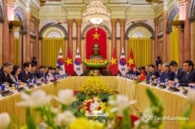 팩트메인뉴스 이훈 기자 | 베트남을 국빈 방문 중인 이재명 대통령은 22일(현지시간) 오후 베트남 국가주석궁에서 또 럼 당서기장 겸 국가주석과 정상회담을 갖고, 양국 간 포괄적 전략 동반자 관계 발전 방안과 지역·국제 정세 등에 대해 심도 있게 논의했다고 이규연 청와대 홍보소통수석이 서면 브리핑했다.