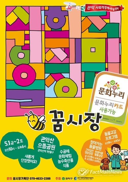 팩트메인뉴스 이훈 기자 | 관악구가 오는 5월 1일과 2일 양일간 관악산 으뜸공원에서 사회적경제장터 ‘꿈시장’과 ‘찾아가는 동물병원’을 함께 개최해 봄나들이객을 반기는 풍성한 콘텐츠를 선보인다.