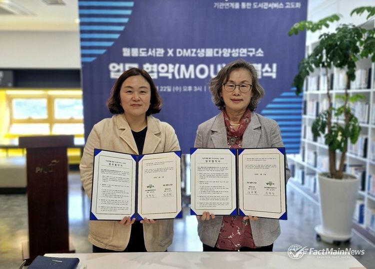 팩트메인뉴스 이훈 기자 | 파주시 월롱도서관은 지난 22일 디엠지(DMZ)생물다양성연구소와 지역사회 독서진흥 및 생태환경 분야 협력을 위한 업무협약을 체결했다.