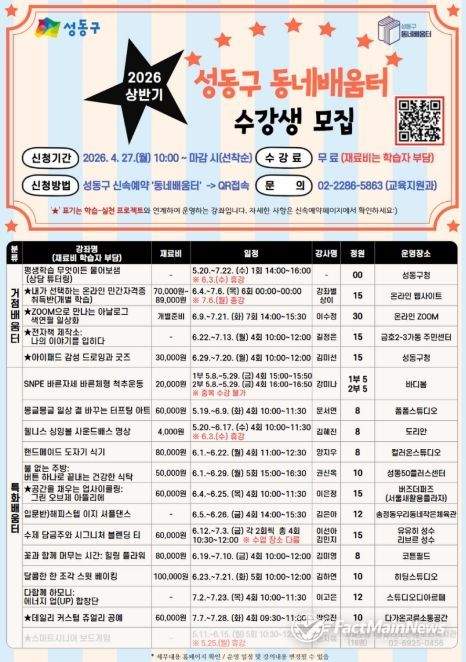 팩트메인뉴스 이훈 기자 | 서울 성동구가 올해 약 3,800만 원의 예산을 투입해 주민 주도형 평생학습 생태계를 조성하는 ‘2026년 성동구 동네배움터’ 운영에 본격적으로 나선다고 밝혔다.