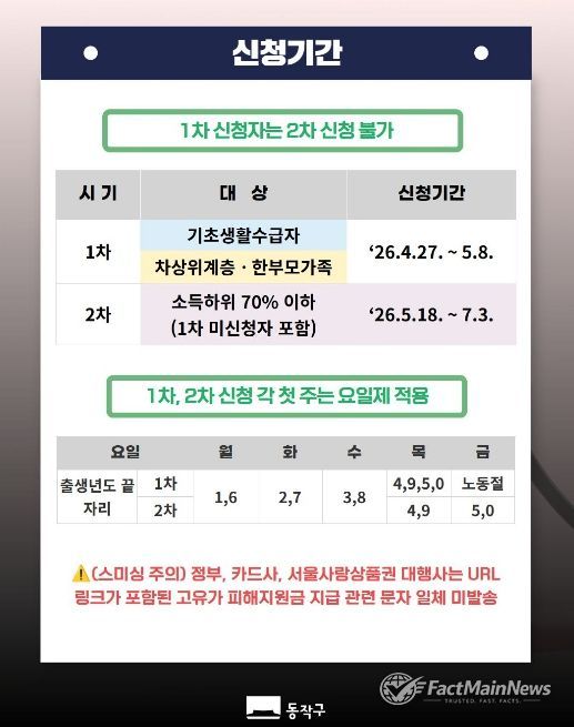 팩트메인뉴스 이훈 기자 | 동작구가 고유가·고환율·고물가로 인한 주민들의 경제적 부담을 완화하기 위해 고유가 피해지원금, 에너지 바우처 등 민생 안정 대책을 추진한다고 밝혔다.