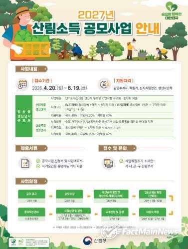 팩트메인뉴스 이훈 기자 | 고흥군은 임산물 생산 기반 확충과 임업 경쟁력 강화를 위해 ‘2027년도 산림소득사업(임산물생산단지 규모화)’ 공모사업 신청을 오는 6월 19일까지 접수한다고 밝혔다.