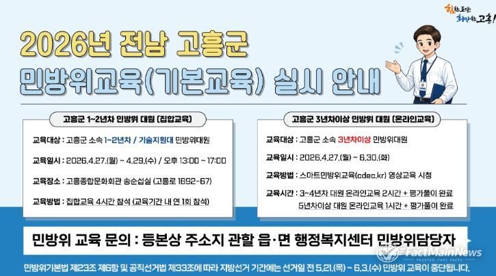 팩트메인뉴스 이훈 기자 | 고흥군은 민방위대원의 대응 역량을 강화하고자 2026년 상반기 민방위 기본교육을 실시한다고 밝혔다.
