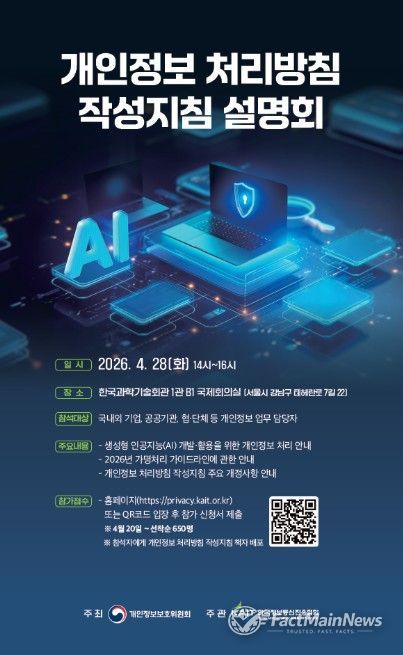 팩트메인뉴스 이훈 기자 | 개인정보보호위원회는 생성형 인공지능(AI) 서비스의 확산과 온디바이스 등 신기술의 등장에 따른 변화된 데이터 처리 환경에 대응해 '개인정보 처리방침 작성지침'을 개정·공개했다.