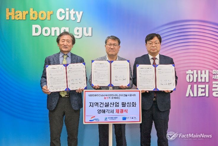 팩트메인뉴스 이훈 기자 | 부산 동구는 4월 23일 대한전문건설협회 부산광역시회 및 동구 관내 건축공사장 시공사인 성무건설 주식회사와 '지역 건설업체 활성화 및 상생 발전을 위한 업무협약(MOU)'을 체결했다.