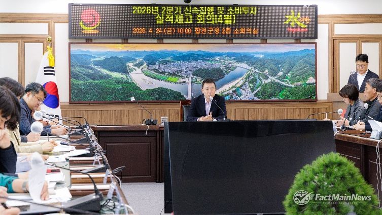 팩트메인뉴스 이훈 기자 | 합천군은 24일 장재혁 합천군수 권한대행 주재로 ‘2026년 2분기 신속집행 대책보고회를 개최하고 지역 경제 활성화를 위한 재정 집행 가속화 방안을 논의했다.
