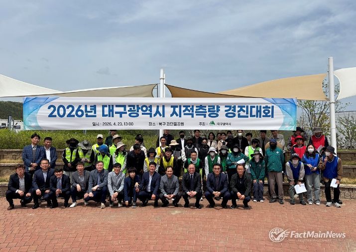 팩트메인뉴스 이훈 기자 | 대구광역시는 4월 23일 북구 검단들공원에서 9개 구·군 지적공무원들이 참여하는 ‘2026년 지적측량 경진대회’를 개최했다. 이번 대회 결과, 중구가 최우수상의 영예를 안았으며, 북구와 동구가 각각 우수상과 장려상을 받았다.