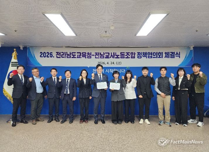 팩트메인뉴스 이훈 기자 | 전라남도교육청과 전남교사노동조합(위원장 김신안)은 24일 전라남도교육청 중회의실에서 ‘2026년도 정책협의회 체결식’을 갖고, 건강한 교육 생태계 조성을 위한 공동의 노력을 약속했다.