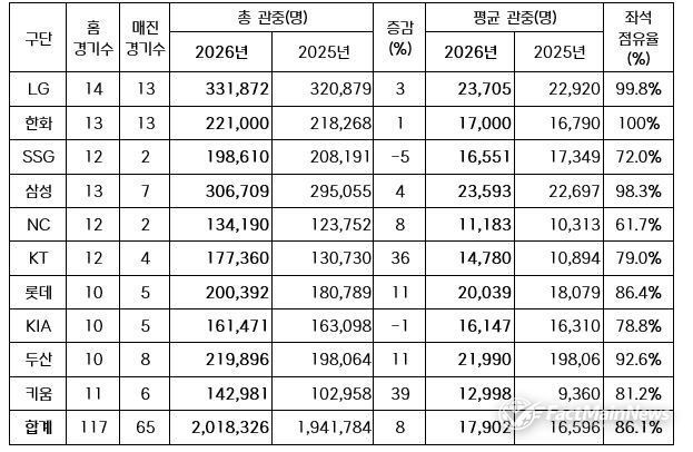 팩트메인뉴스 이훈 기자 | 2026 신한 SOL KBO 리그가 오늘(25일) 열린 잠실, 문학, 광주, 고척, 대전 경기에서 총 9만 9,905명이 입장하며 200만 관중을 달성했다.