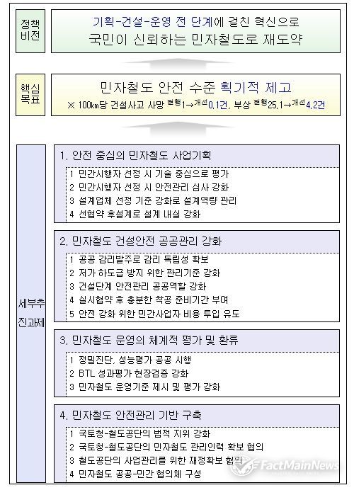팩트메인뉴스 이훈 기자 | 국토교통부는 민자철도 건설현장에서의 안전사고 재발을 방지하고, 국민이 안전하게 이용하는 민자철도를 구축하기 위해 「민자철도 안전관리 강화방안」을 추진한다.