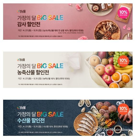 팩트메인뉴스 이훈 기자 | 경상남도와 (재)경상남도투자경제진흥원이 운영하는 e경남몰(egnmall.kr)은 5월 가정의 달을 맞이해 4월 27일부터 예산 소진 시까지 전 품목을 대상으로 한 대규모 할인 기획전을 진행한다.