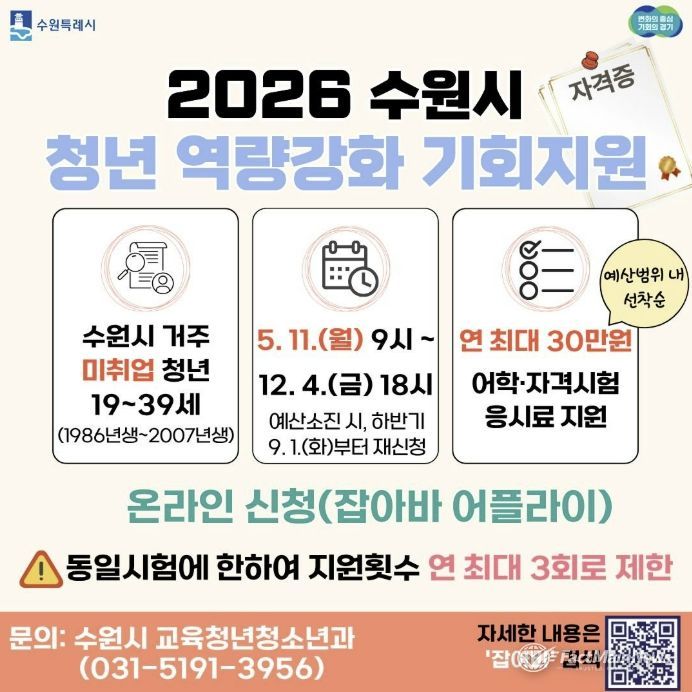 팩트메인뉴스 이훈 기자 | 수원특례시는 미취업 청년의 취업 준비 비용 부담을 덜어주는 ‘청년 역량강화 기회 지원 사업’을 12월 4일까지 운영한다. 미취업 청년에게 어학·자격시험 응시료를 1인당 연 최대 30만 원 지원한다.