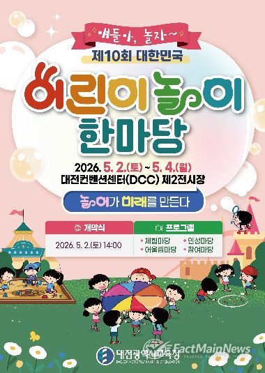 팩트메인뉴스 이훈 기자 | 대전시교육청은 제104회 어린이날을 맞아 오는 5월 2일부터 4일까지 3일간 대전컨벤션센터(DCC) 제2전시장에서 ‘제10회 대한민국 어린이 놀이 한마당’을 개최한다고 밝혔다.