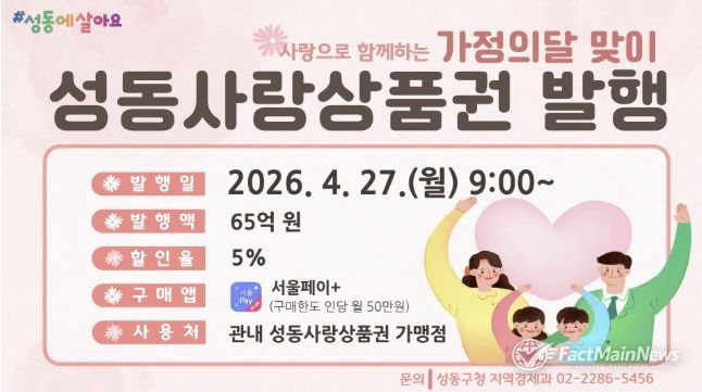 팩트메인뉴스 이훈 기자 | 서울 성동구는 고물가로 위축된 소비 심리를 회복하고 지역경제에 활력을 불어넣기 위해 총 65억 원 규모의 성동사랑상품권을 추가 발행한다고 밝혔다.