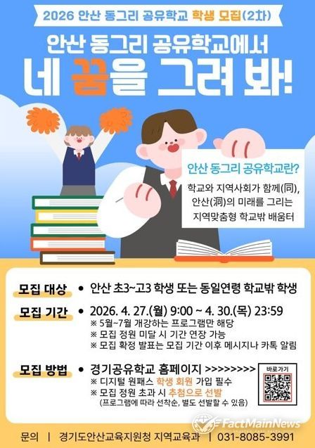 팩트메인뉴스 이훈 기자 | 안산시 중앙도서관은 내달부터 안산교육지원청이 추진하는 ‘2026년 안산 동그리 우리동네 도서관 공유학교’ 사업에 참여해 지역 교육 인프라 확충에 나선다고 27일 밝혔다.