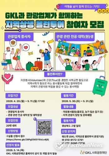 팩트메인뉴스 이훈 기자 | 고령문화관광재단은 GKL사회공헌재단과 협력하여 오는 5월 30일부터 31일까지 이틀간 ‘GKL 지역상생 볼런투어’를 경상북도 고령 일대에서 운영한다고 밝혔다.