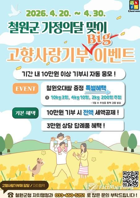 철원군은 4월 4월 30일까지 ‘철원군 가정의 달 맞이 고향사랑기부 이벤트’를 진행한다.