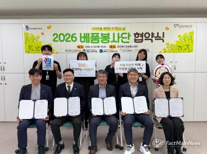 팩트메인뉴스 이훈 기자 | 대구북구자원봉사센터는 지난 4월 23일, 관내 5개 노인복지관과 협력하여 은퇴 세대의 주도적 사회공헌 활성화를 위한 ‘베이비붐 세대의 품격있는 삶, 베품봉사단’ 공동 업무협약식을 진행했다.