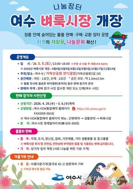팩트메인뉴스 이훈 기자 | 여수시는 오는 5월 9일 오후 1시부터 4시까지 거북선공원 잔디광장에서 ‘2026년 제2차 여수 벼룩시장’을 개최한다고 밝혔다.