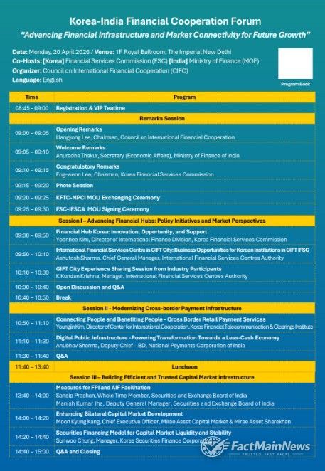 팩트메인뉴스 이훈 기자 | 금융위원회 이억원 위원장은 4월 19일~25일 4박 7일 일정으로 대통령의 인도·베트남 해외순방에 동행했다. 주요 일정으로는 한국 금융회사 해외진출 및 영업 확대 지원을 위한 고위급 정부회담, 금융중심지 육성 및 국경간 QR 결제망 연동 등을 위한 금융협력포럼 개최, 현지 금융회사·기업 간담회 등을 진행했다. 이번 방문은 고속 성장 중인 두 핵심 파트너 국가와의 ‘전략적 협력 고도화’라는 목표를 금융분야에서 적극 뒷받침하기 위해 마련된 것으로, 인도의 경우 금융위원장으로서는 첫 방문이다.