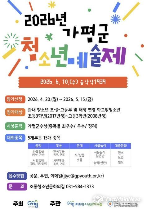 팩트메인뉴스 이훈 기자 | 가평군이 오는 6월 10일 열리는 ‘2026년 가평군청소년예술제’를 앞두고 예술적 끼와 재능을 겨룰 청소년들을 5월 15일까지 모집한다.