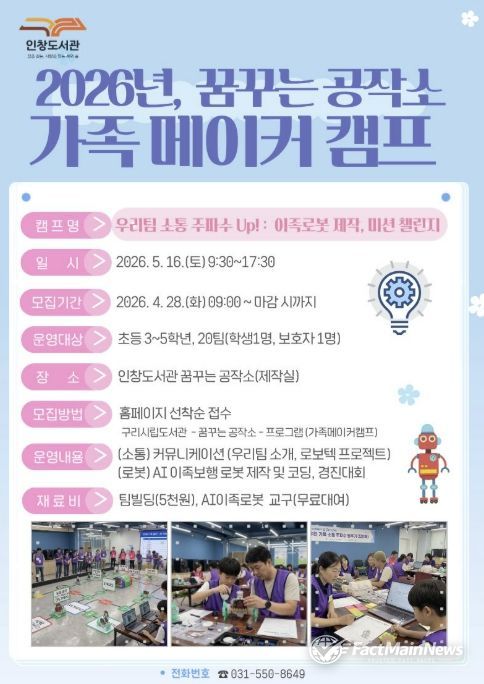 팩트메인뉴스 이훈 기자 | 구리시 인창도서관‘꿈꾸는 공작소’는 오는 5월 16일 초등학생 자녀와 보호자가 함께 참여해 가족 간 유대감을 높이고 인공지능을 체험하는 '우리 팀 소통 주파수 Up! : 이족로봇 제작, 미션 챌린지' 가족 메이커 캠프를 운영한다고 밝혔다.