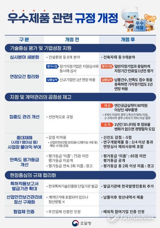 팩트메인뉴스 이훈 기자 | 조달청은 기업의 성장을 지원하고, 공정한 경쟁환경을 조성하기 위해 우수조달물품 관련 규정을 개정하여 4월 27일부터 시행한다고 밝혔다.