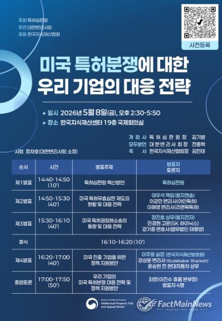팩트메인뉴스 이훈 기자 | 지식재산처 특허심판원은 5월 8일 14시 30분 한국지식재산센터(서울 강남구)에서 우리 기업의 미국 특허분쟁 대응 역량 강화를 위해 '미국 특허분쟁에 대한 우리 기업의 대응전략' 발표회를 개최한다고 밝혔다.
