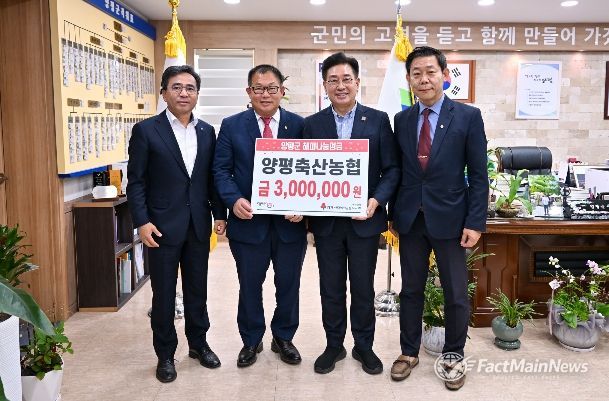 팩트메인뉴스 이훈 기자 | 양평군은 지난 23일 양평축산농협이 취약계층을 위한 해피나눔성금 300만 원을 기탁했다고 밝혔다.