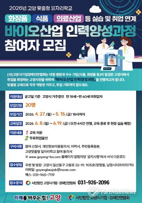 팩트메인뉴스 이훈 기자 | 고양특례시는 2026년 고양맞춤형 일자리학교 공모사업 중 ‘바이오산업 인력 양성과정’의 참여자를 모집한다.
