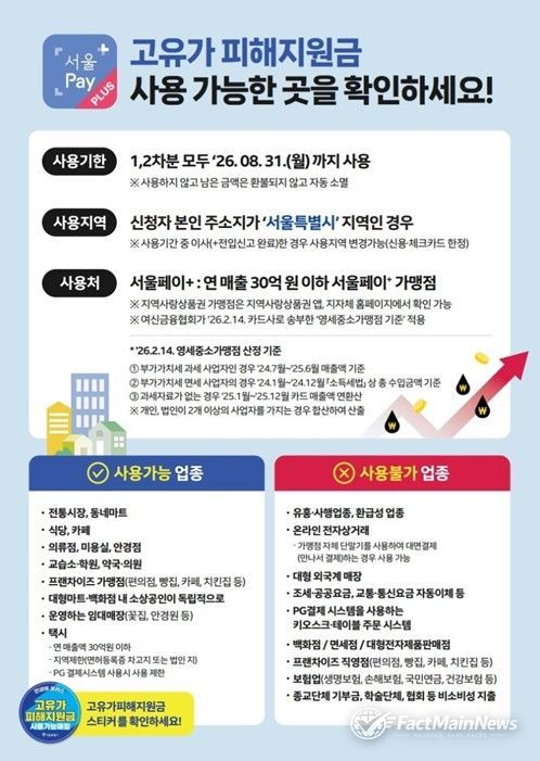 팩트메인뉴스 이훈 기자 | 서울시는 ‘고유가 피해지원금’을 서울사랑상품권으로 신청하면 서울 시내 약 48만 가맹점과 '서울배달+땡겨요' 등 온·오프라인에서 폭넓게 사용할 수 있고, 기존 보유한 상품권과 합산결제도 가능하다고 밝혔다. 신청은 27일 오전 9시부터 서울페이플러스 앱에서 할 수 있다.